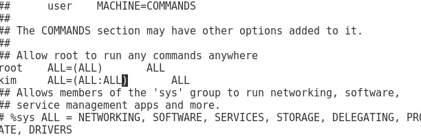 중간에 root ALL=(ALL) ALL 라인을 확인할 수 있습니다.